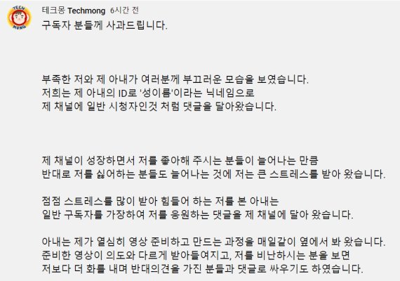 유튜버 테크몽 사과문 캡쳐